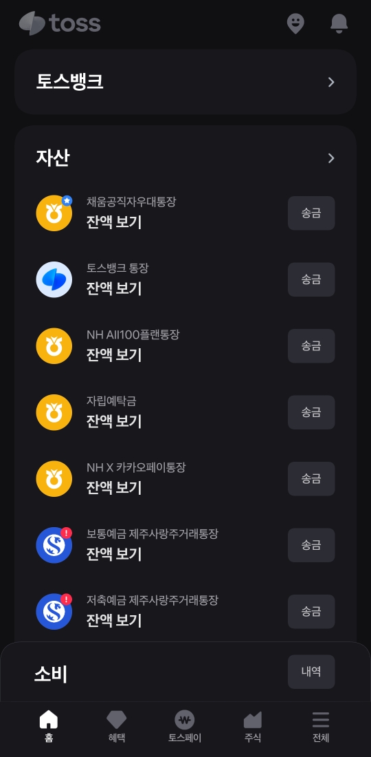 토스 실행 시 홈화면에서