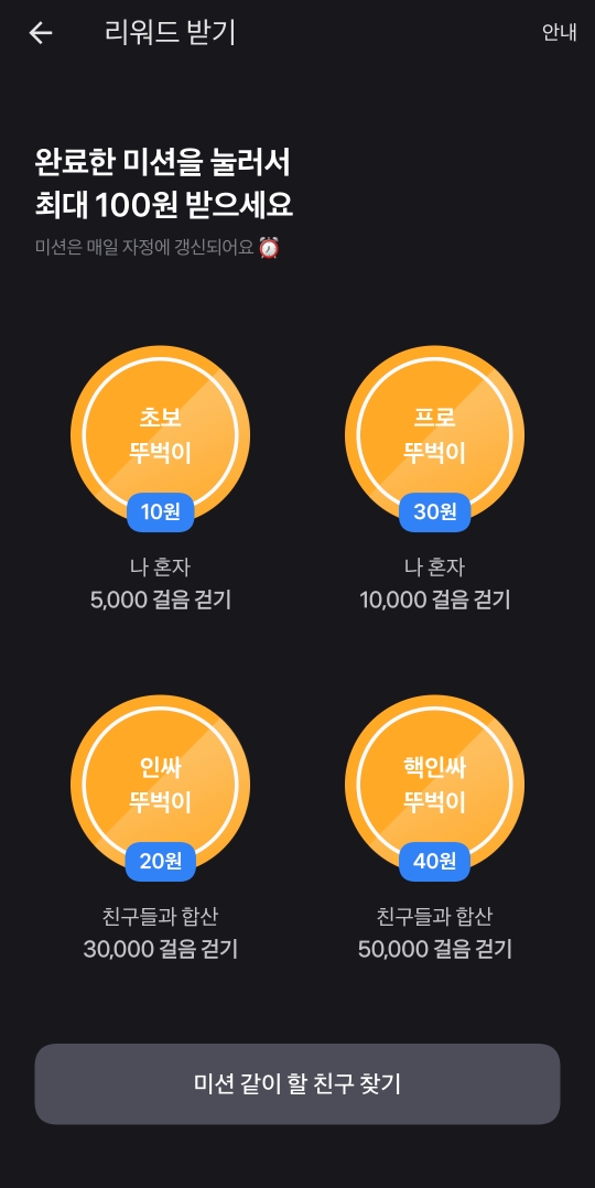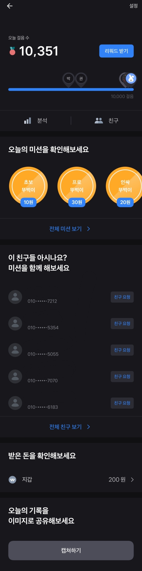 걸음수, 미션, 번호, 지갑, 이미지 공유가 있습니다.